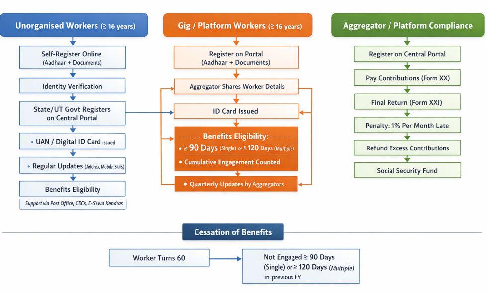 Registration of Workers: All unorganised, gig, and platform workers must register to access social security benefits.